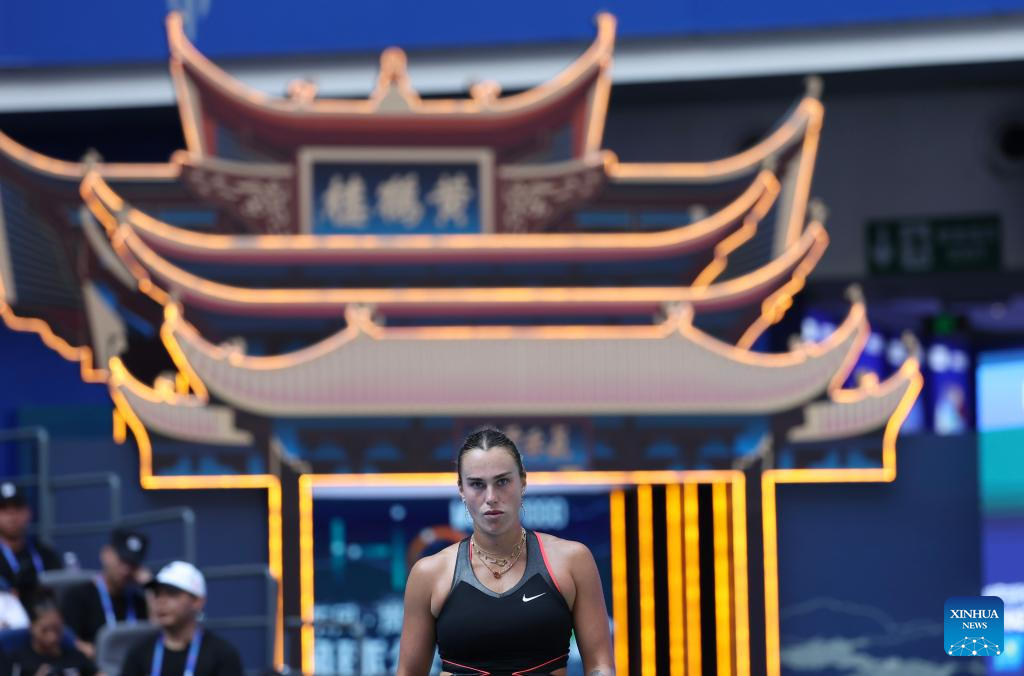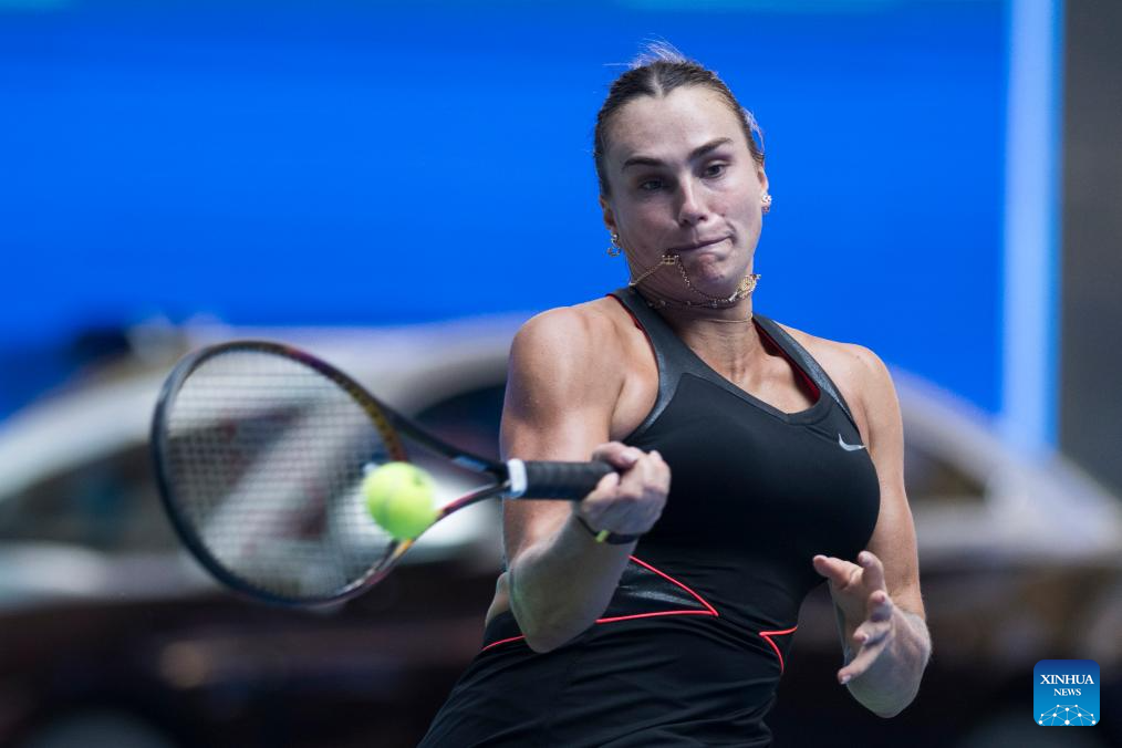 WUHAN, 10 octubre, 2025 (Xinhua) -- Aryna Sabalenka devuelve la pelota durante el partido de cuartos de final de individuales femeninos entre Elena Rybakina, de Kazajistán, y Aryna Sabalenka, de Bielorrusia, en el torneo de tenis Wuhan Open 2025, en Wuhan, en la provincia de Hubei, en el centro de China, el 10 de octubre de 2025. (Xinhua/Wu Zhizun)