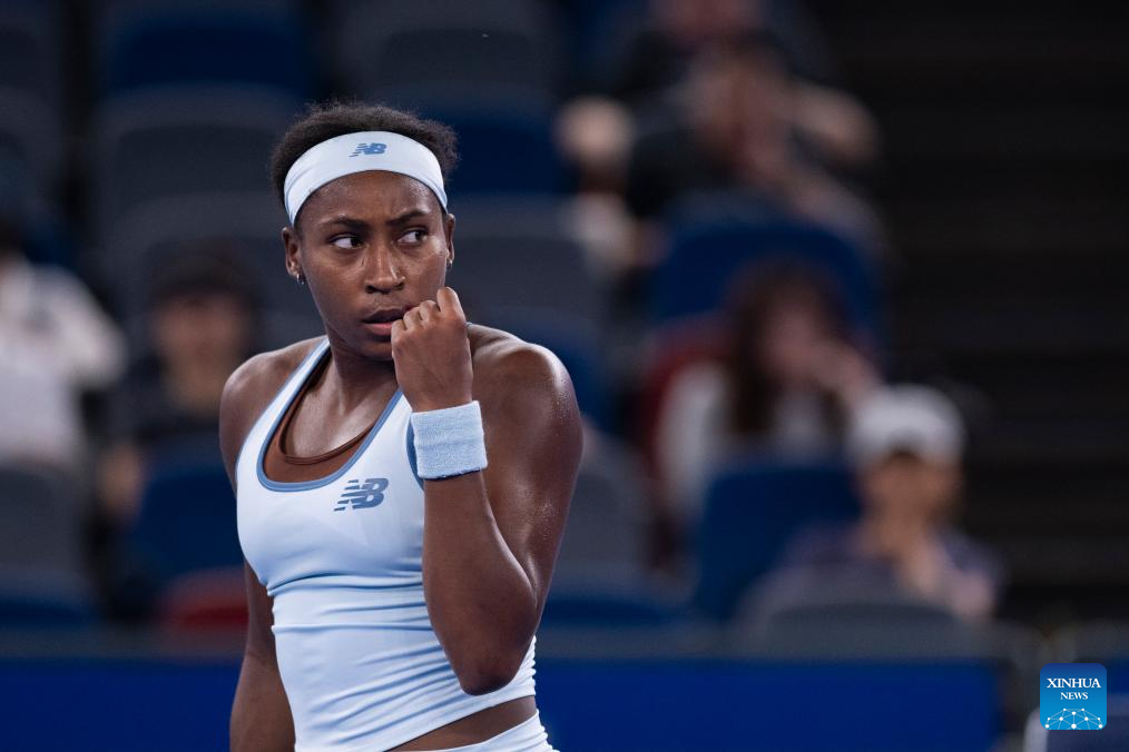 WUHAN, 10 octubre, 2025 (Xinhua) -- Imagen del 9 de octubre de 2025 de Coco Gauff, de Estados Unidos, festejando un punto durante el partido de octavos de final de individuales femeninos ante Zhang Shuai, de China, en el torneo de tenis Wuhan Open 2025, en Wuhan, en la provincia de Hubei, en el centro de China. (Xinhua/Wu Zhizun)