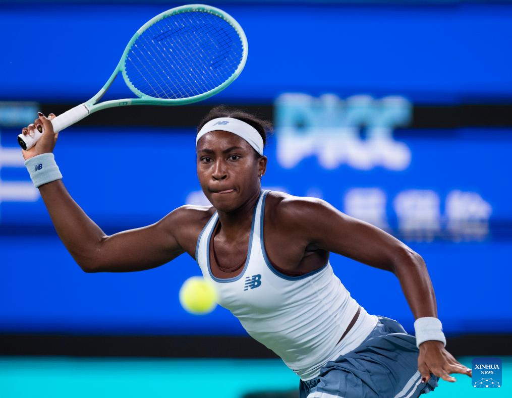 WUHAN, 10 octubre, 2025 (Xinhua) -- Imagen del 9 de octubre de 2025 de Coco Gauff, de Estados Unidos, devolviendo la pelota durante el partido de octavos de final de individuales femeninos ante Zhang Shuai, de China, en el torneo de tenis Wuhan Open 2025, en Wuhan, en la provincia de Hubei, en el centro de China. (Xinhua/Wu Zhizun)