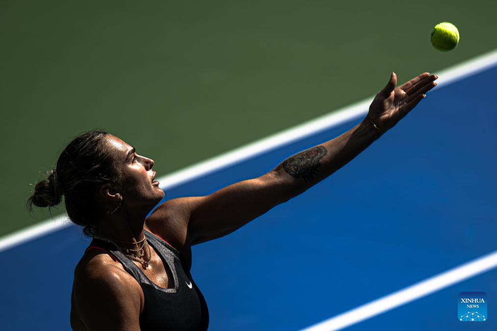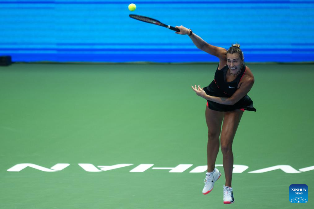 WUHAN, 10 octubre, 2025 (Xinhua) -- Aryna Sabalenka sirve la pelota durante el partido de cuartos de final de individuales femeninos entre Elena Rybakina, de Kazajistán, y Aryna Sabalenka, de Bielorrusia, en el torneo de tenis Wuhan Open 2025, en Wuhan, en la provincia de Hubei, en el centro de China, el 10 de octubre de 2025. (Xinhua/Xiao Yijiu)