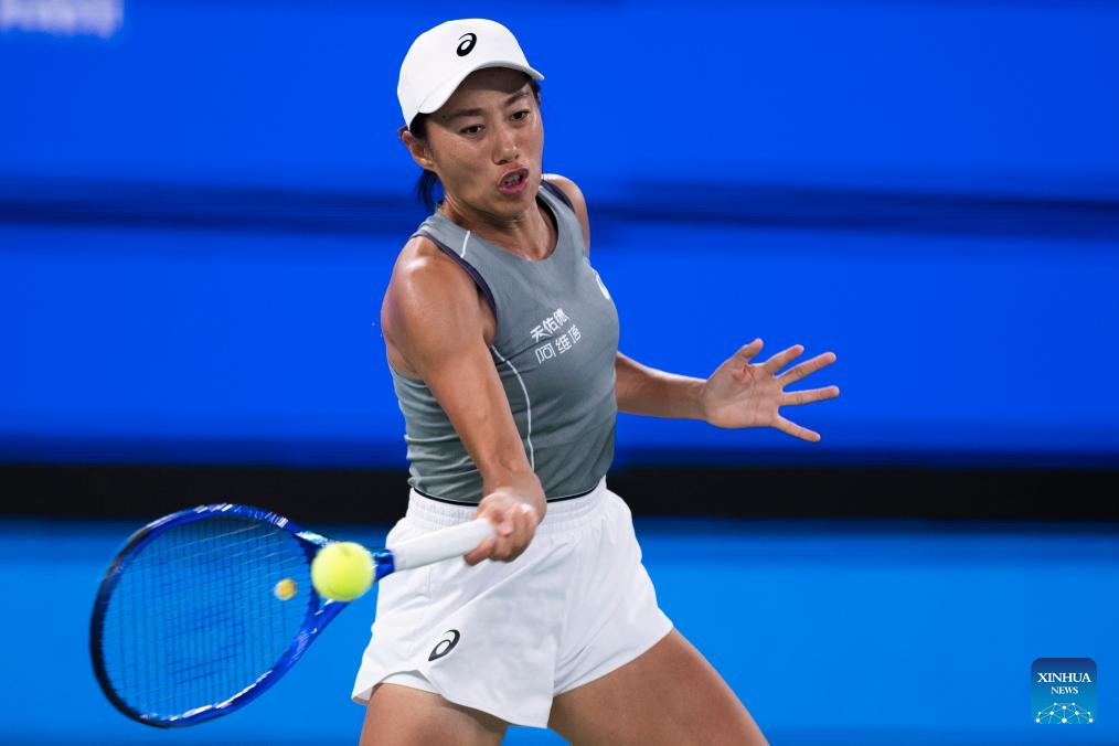 WUHAN, 10 octubre, 2025 (Xinhua) -- Imagen del 9 de octubre de 2025 de Zhang Shuai, de China, devolviendo la pelota durante el partido de octavos de final de individuales femeninos ante Coco Gauff, de Estados Unidos, en el torneo de tenis Wuhan Open 2025, en Wuhan, en la provincia de Hubei, en el centro de China. (Xinhua/Wu Zhizun)