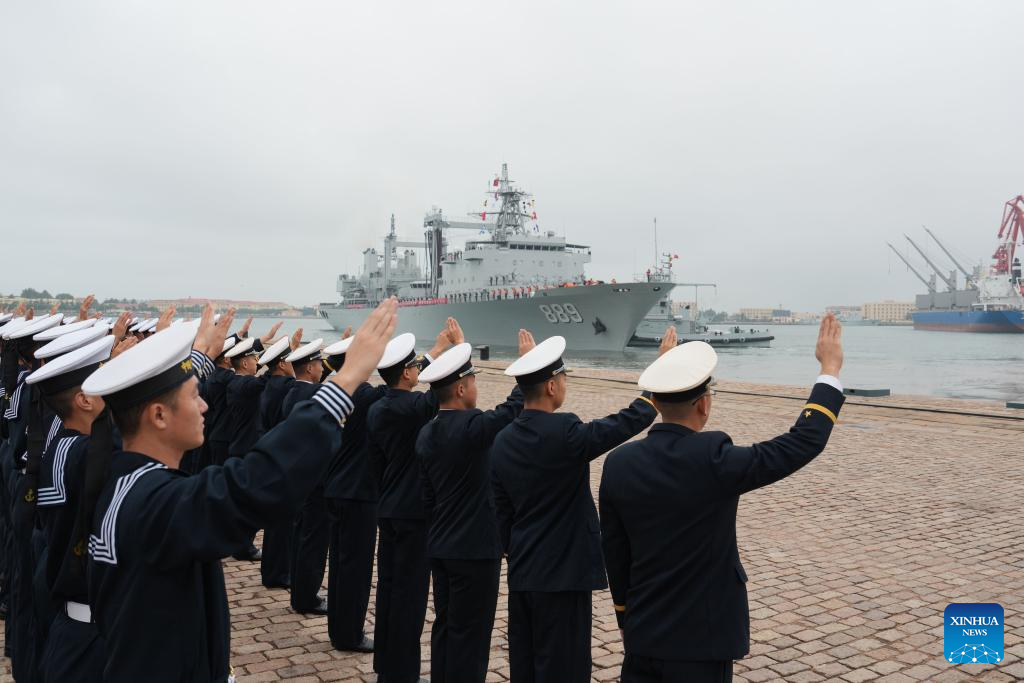 Oficiales y soldados se despiden del buque de suministro integral Taihu en un puerto, en Qingdao, en la provincia de Shandong, en el este de China, el 11 de octubre de 2025. Una nueva flota de la Armada del Ejército Popular de Liberación de China zarpó el sábado de un puerto militar en Qingdao, provincia de Shandong, en el este de China, para relevar a la flota anterior en una misión de escolta en el Golfo de Adén y las aguas frente a las costas de Somalia. Se trata de la 48ª flota naval, compuesta por un destructor de misiles, una fragata de misiles y un buque de suministro, con dos helicópteros y decenas de miembros de fuerzas especiales a bordo. (Xinhua/Liu Zaiyao)