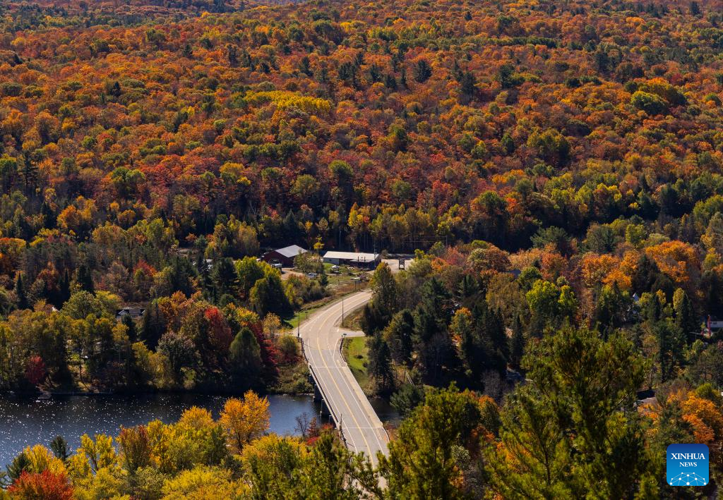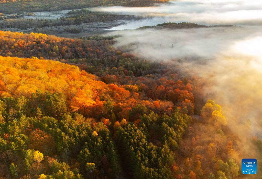 HUNTSVILLE, 10 octubre, 2025 (Xinhua) -- Vista aérea tomada con un dron el 9 de octubre de 2025 del paisaje de otoño cerca de Huntsville, en Ontario, Canadá. (Xinhua/Zou Zheng)