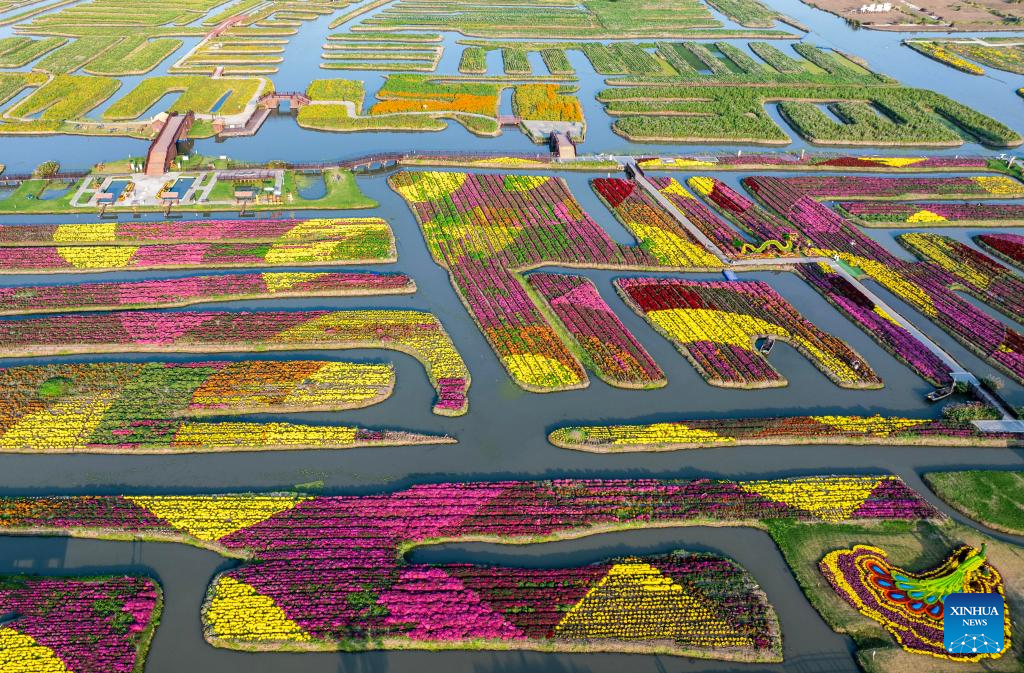 BEIJING, 11 octubre, 2025 (Xinhua) -- Vista aérea tomada con un dron el 11 de octubre de 2025 del paisaje de crisantemos en flor, en Xinghua, en la provincia de Jiangsu, en el este de China. (Xinhua/Zhou Shegen)