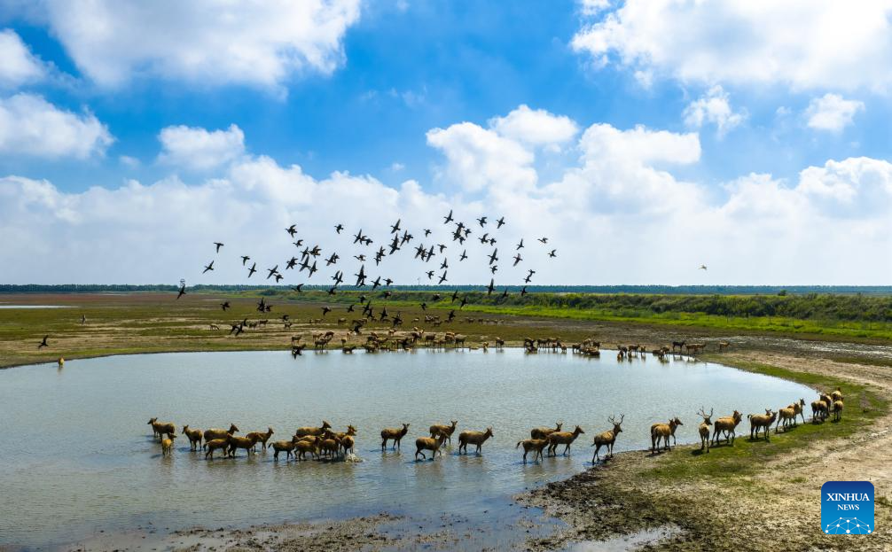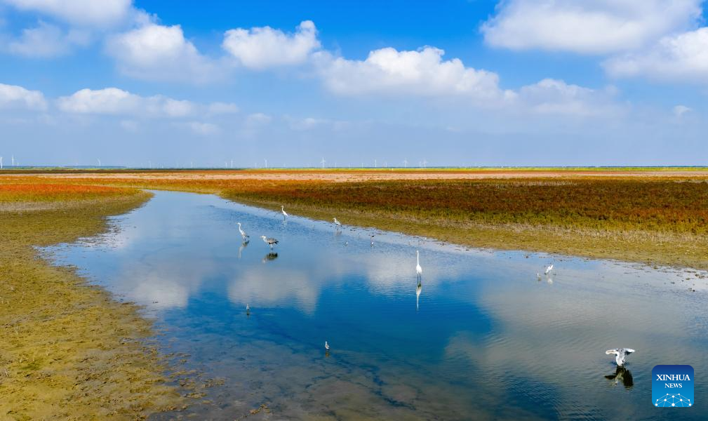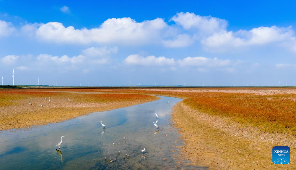 BEIJING, 11 octubre, 2025 (Xinhua) -- Vista aérea tomada con un dron el 11 de octubre de 2025 del paisaje de un humedal, en Dongtai, en la provincia de Jiangsu, en el este de China. (Xinhua/Sun Jialu)