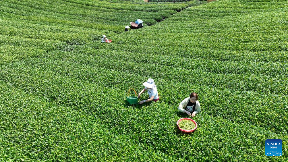 BEIJING, 11 octubre, 2025 (Xinhua) -- Vista aérea tomada con un dron el 10 de octubre de 2025 de turistas experimentando la recolección de hojas de té en un jardín de té, en el poblado de Moganshan de Huzhou, en la provincia de Zhejiang, en el este de China. (Xinhua/Xie Shangguo)