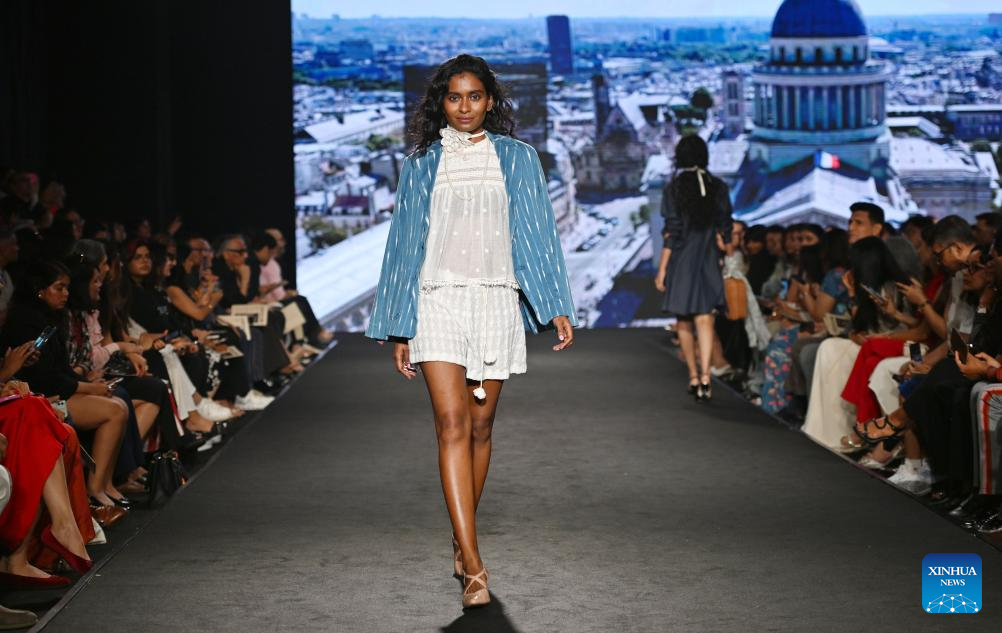 NUEVA DELHI, 11 octubre, 2025 (Xinhua) -- Una modelo presenta una creación de la diseñadora india Payal Jain durante la Semana de la Moda Lakme x FDCI, en Nueva Delhi, India, el 11 de octubre de 2025. (Xinhua/Javed Dar)