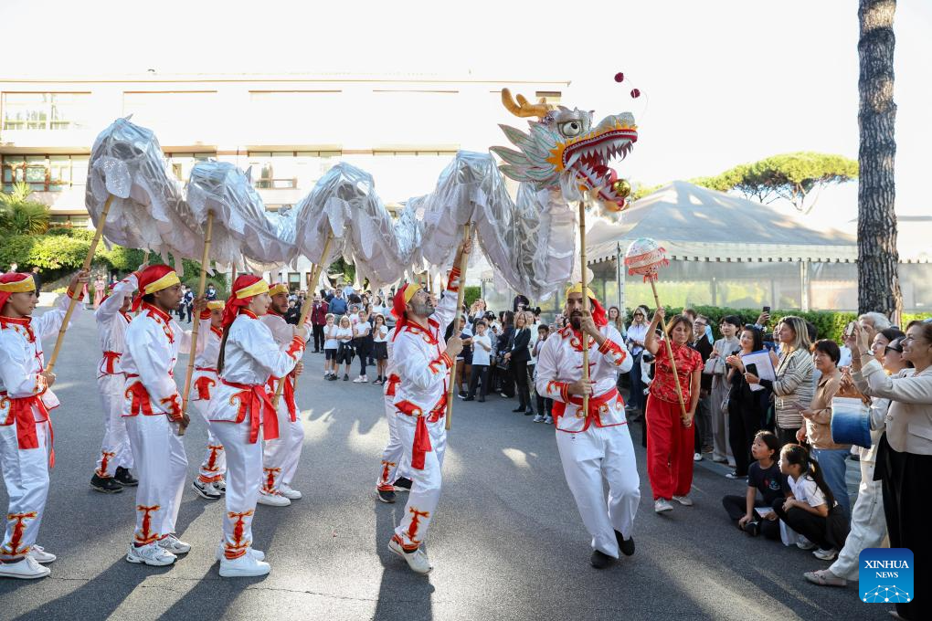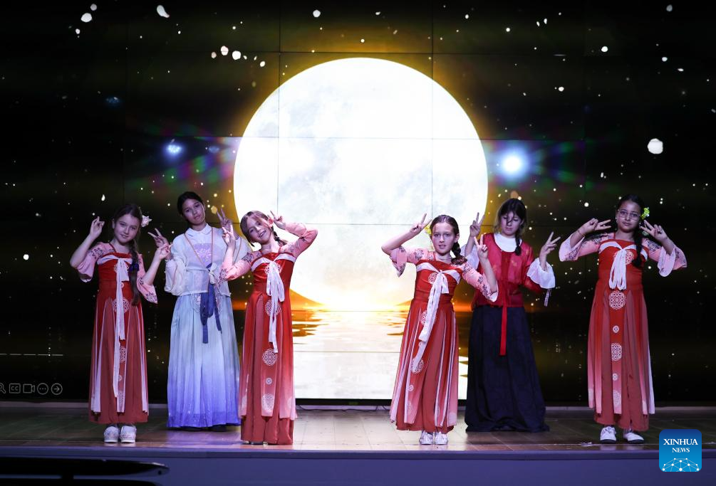 ROMA, 11 octubre, 2025 (Xinhua) -- Imagen del 10 de octubre de 2025 de estudiantes realizando una presentación durante una feria de atracciones con temática del Festival de Medio Otoño en la Escuela Internacional Marymount, en Roma, Italia. La feria de atracciones se llevó a cabo aquí el viernes, donde estudiantes y residentes locales disfrutaron de una variedad de actividades y espectáculos culturales chinos presentados por entusiastas locales de la cultura china. (Xinhua/Li Jing)