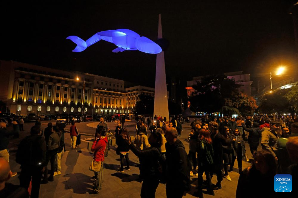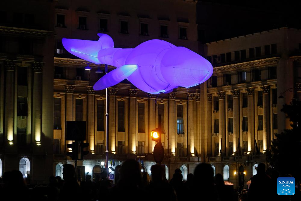 BUCAREST, 11 octubre, 2025 (Xinhua) -- Imagen del 10 de octubre de 2025 de una instalación de arte lumínico que representa una ballena voladora vista durante el Festival Spotlight, en Bucarest, Rumanía. (Xinhua/Cristian Cristel)