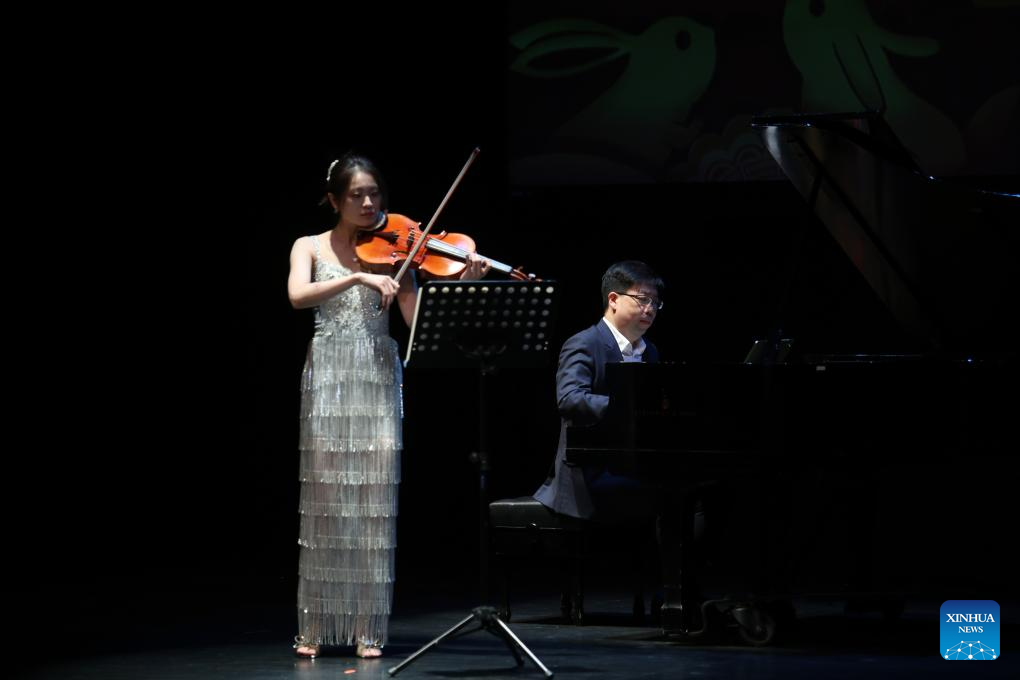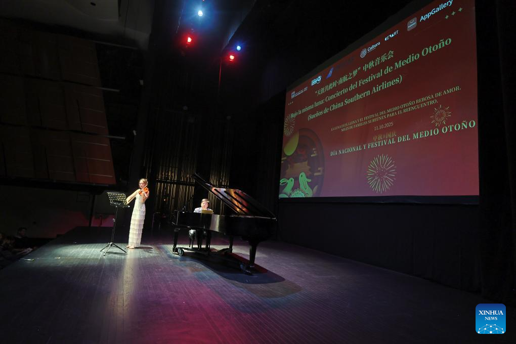 CIUDAD DE MEXICO, 12 octubre, 2025 (Xinhua) -- Imagen del 11 de octubre de 2025 del pianista Ding Yang (d) y la violista Lu Jie (i) realizando una presentación durante la gala "Bajo la misma luna: Concierto del Festival de Medio Otoño" en el Centro Nacional de las Artes, en la Ciudad de México, capital de México. Entre melodías, colores y símbolos de luna llena, México celebró el sábado el Festival de Medio Otoño de China con un emotivo concierto de gala que reflejó la belleza y espiritualidad de una de las festividades más importantes del pueblo chino. (Xinhua/Alejandro Medina)