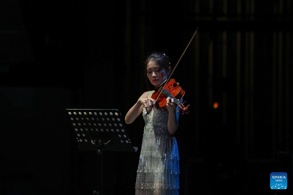 CIUDAD DE MEXICO, 12 octubre, 2025 (Xinhua) -- Imagen del 11 de octubre de 2025 de la violista Lu Jie realizando una presentación durante la gala "Bajo la misma luna: Concierto del Festival de Medio Otoño" en el CCentro Nacional de las Artes, en la Ciudad de México, capital de México. Entre melodías, colores y símbolos de luna llena, México celebró el sábado el Festival de Medio Otoño de China con un emotivo concierto de gala que reflejó la belleza y espiritualidad de una de las festividades más importantes del pueblo chino. (Xinhua/Alejandro Medina)