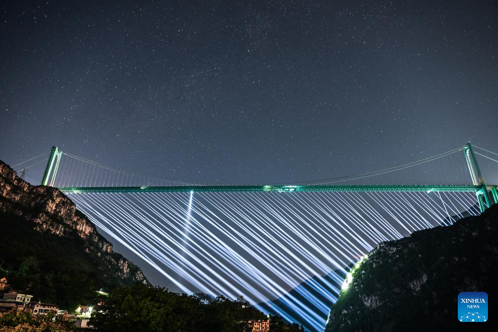 ZHENFENG, 12 octubre, 2025 (Xinhua) -- Imagen del 11de octubre de 2025 de un espectáculo de luces celebrado en el puente del Gran Cañón de Huajiang, en la provincia de Guizhou, en el suroeste de China. El puente del Gran Cañón de Huajiang, que se eleva 625 metros sobre el río Beipan en el terreno montañoso de Guizhou, es el puente más alto del mundo. Con un vano principal de 1.420 metros, el proyecto se ha convertido en el puente colgante con vigas de acero de mayor vano del mundo en terreno montañoso, según las autoridades provinciales de Guizhou. (Xinhua/Yang Wenbin)