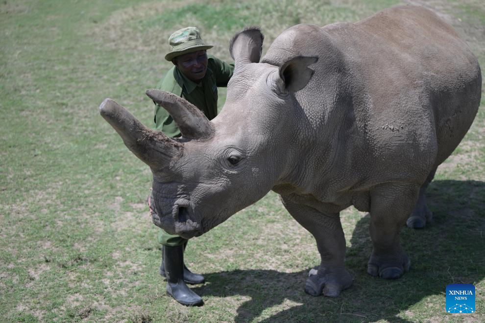 NAIROBI, 12 octubre, 2025 (Xinhua) -- Imagen del 7 de octubre de 2025 de un trabajador interactuando con la rinoceronte blanca del norte "Fatu" en la reserva Ol Pejeta, en el distrito de Laikipia, Kenia. "Najin" y "Fatu" son los dos últimos rinocerontes blancos del norte que quedan en la Tierra. Ahora viven en la reserva Ol Pejeta, en el distrito de Laikipia, Kenia. (Xinhua/Yang Guang)