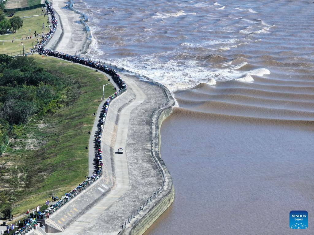 JIAXING, 12 octubre, 2025 (Xinhua) -- Vista aérea tomada con un dron el 10 de octubre de 2025 de turistas observando la marejada del río Qiantang, en la ciudad de Haining, en la provincia de Zhejiang, en el este de China. La marejada del río Qiantang, famosa por su altura y velocidad, es una atracción turística tradicional en la provincia de Zhejiang. Cada año, olas gigantes rompen en las orillas del río, cerca de la ciudad de Haining. Tras el reflujo de la marea, aparecen diferentes patrones con forma de árbol en la llanura de marea. (Xinhua/Xu Yu)