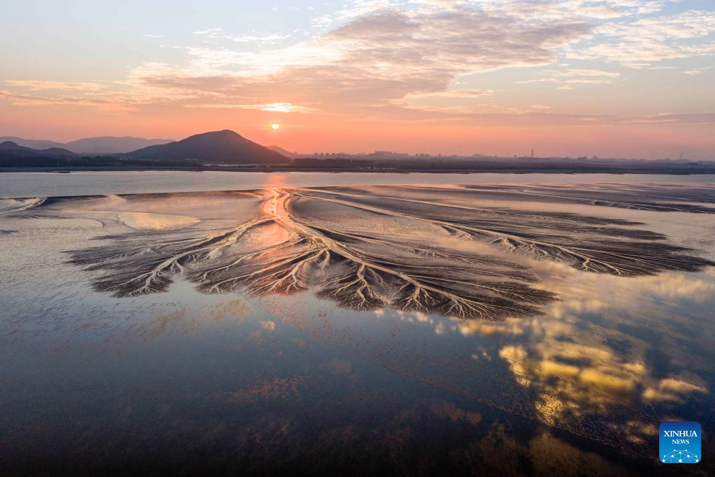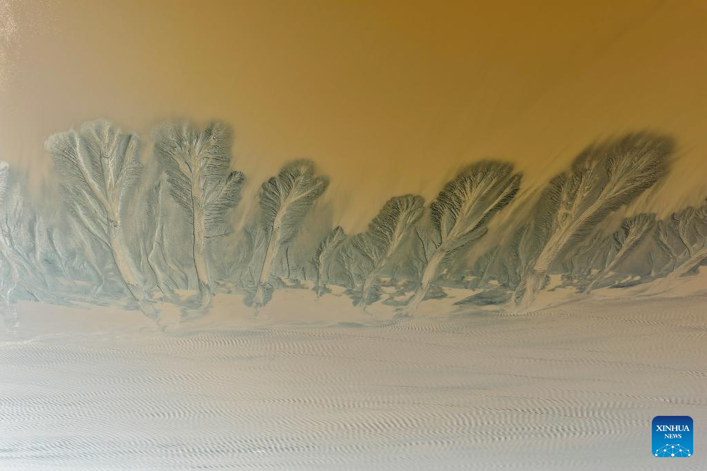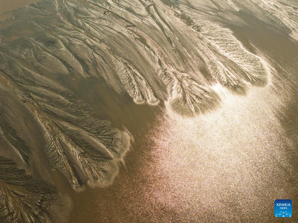 JIAXING, 12 octubre, 2025 (Xinhua) -- Vista aérea tomada con un dron el 11 de octubre de 2025 de una llanura de marea después del retroceso de la marejada del río Qiantang, en la ciudad de Haining, en la provincia de Zhejiang, en el este de China. La marejada del río Qiantang, famosa por su altura y velocidad, es una atracción turística tradicional en la provincia de Zhejiang. Cada año, olas gigantes rompen en las orillas del río, cerca de la ciudad de Haining. Tras el reflujo de la marea, aparecen diferentes patrones con forma de árbol en la llanura de marea. (Xinhua/Xu Yu)