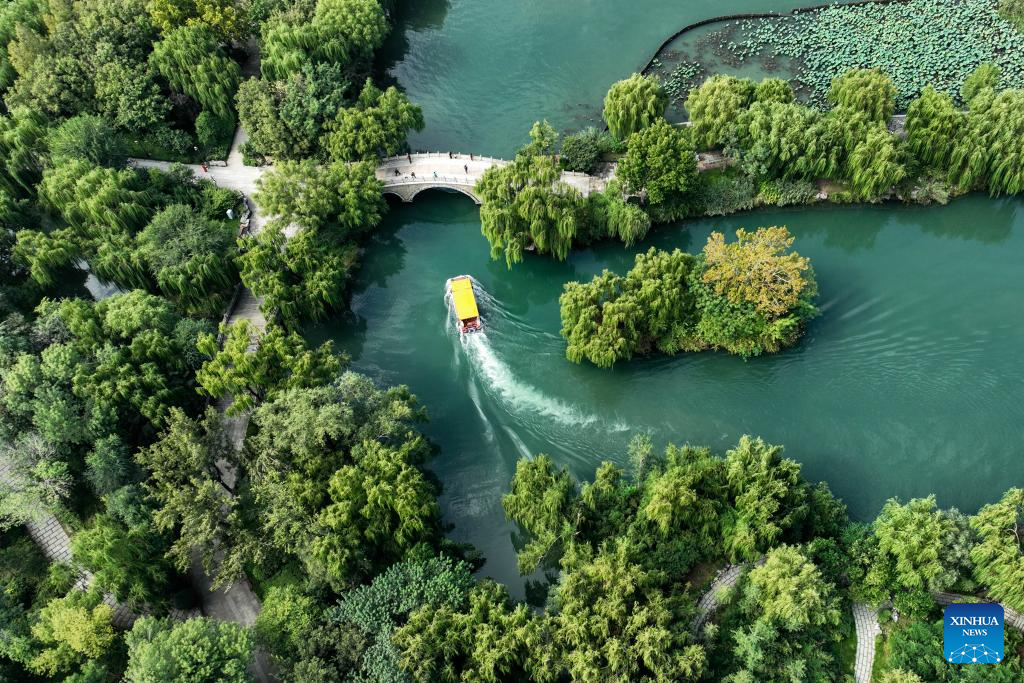 BEIJING, 13 octubre, 2025 (Xinhua) -- Vista aérea tomada con un dron el 13 de octubre de 2025 de turistas realizando un recorrido en barco en un punto escénico, en la ciudad de Jinan, en la provincia de Shandong, en el este de China. (Xinhua/Hao Xincheng)