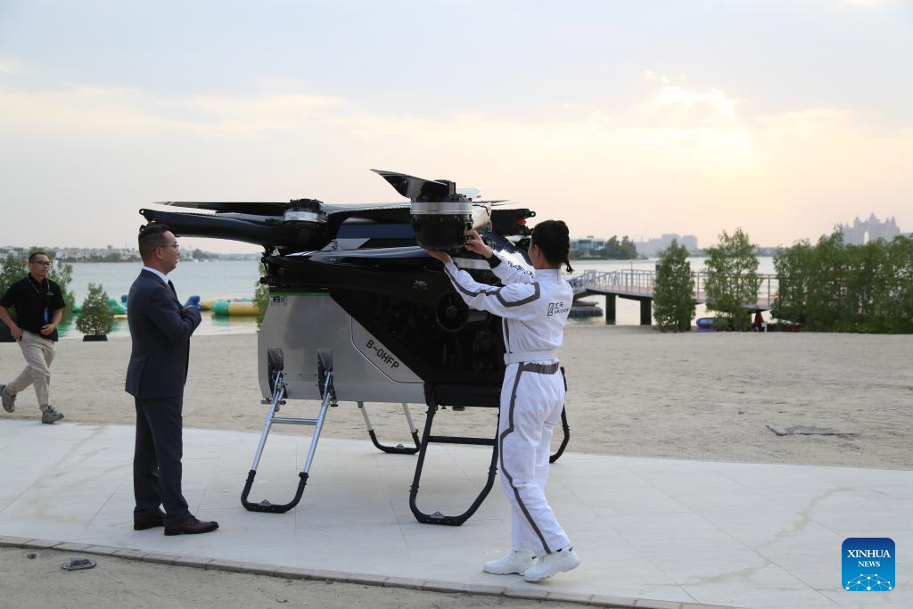 DUBAI, 13 octubre, 2025 (Xinhua) -- Imagen del 12 de octubre de 2025 de un vehículo volador desarrollado por la compañía china XPENG AEROHT durante un vuelo de demostración, en Dubái, Emiratos Arabes Unidos (EAU). Un vehículo volador desarrollado por la compañía china XPENG AEROHT surcó el domingo los cielos de Dubái, EAU, lo que supone un paso significativo en el alcance global de la tecnología de aeronaves de baja altitud de China. (Xinhua/Wen Xinnian)
