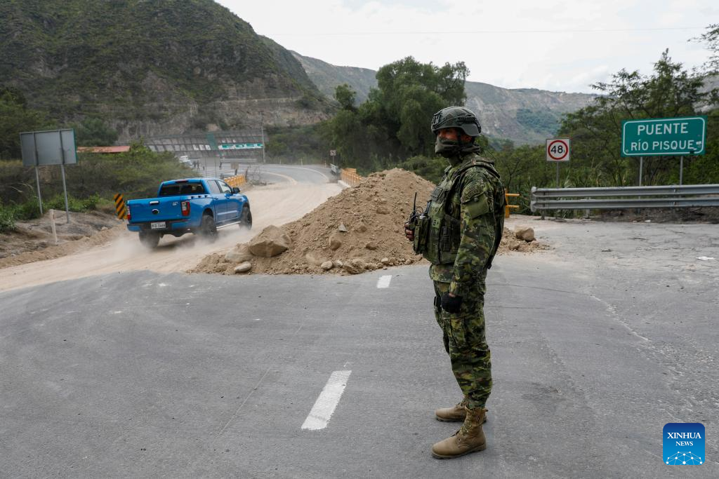 Un militar vigila el acceso al puente del río Pisque durante un operativo de control vehicular en el marco del paro nacional, en Guayllabamba, en la provincia de Pichincha, en la ciudad de Quito, capital de Ecuador, el 13 de octubre de 2025. Ecuador entró el lunes en la cuarta semana del paro nacional indefinido convocado por la Confederación de Nacionalidades Indígenas del Ecuador contra la eliminación del subsidio al diésel, sin que exista un diálogo con el Gobierno para poner fin a las protestas, confirmaron las autoridades locales. (Xinhua/Ricardo Landeta)