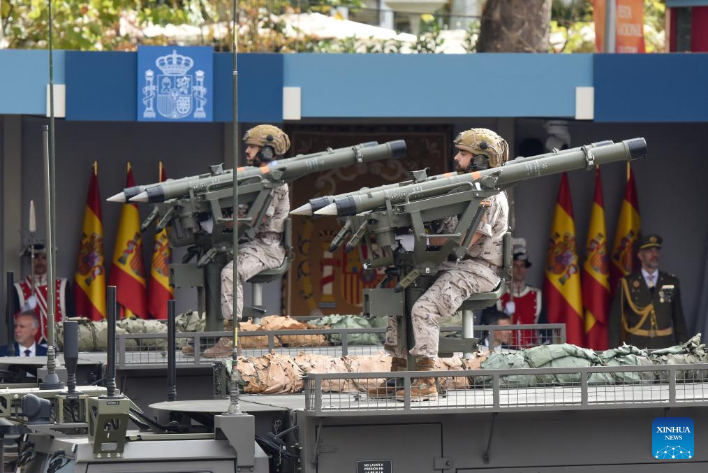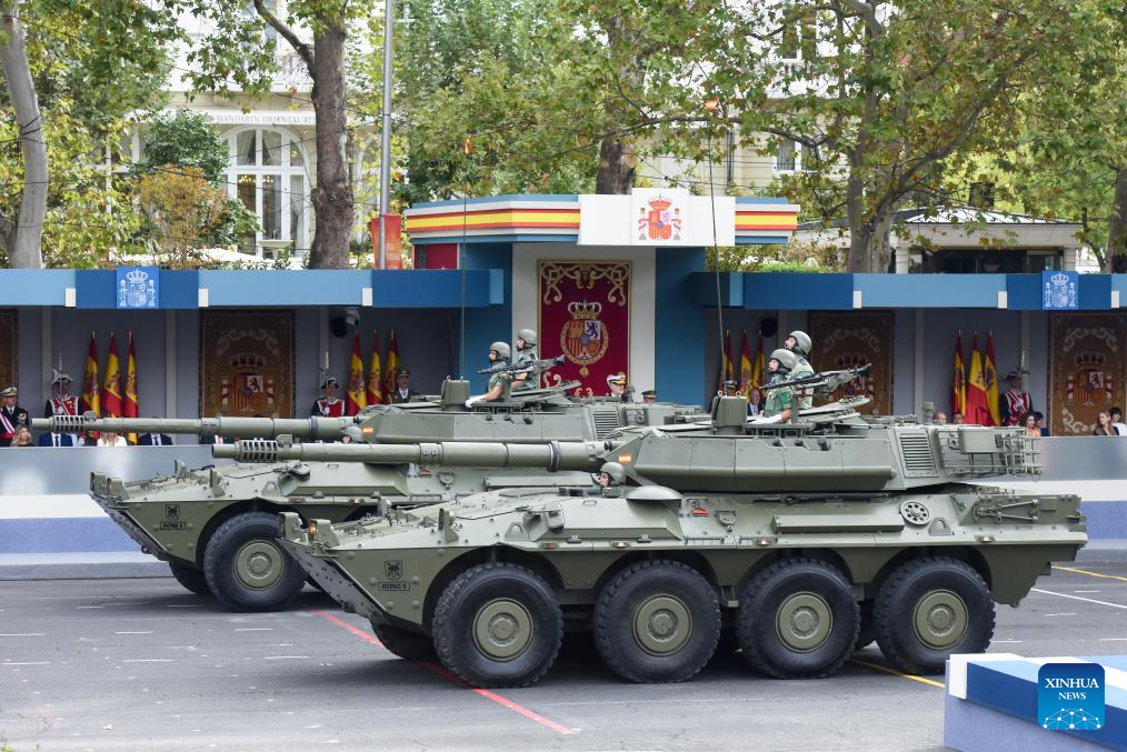 MADRID, 13 octubre, 2025 (Xinhua) -- Imagen del 12 de octubre de 2025 de vehículos militares vistos durante un desfile militar conmemorativo por el Día Nacional, en Madrid, España. (Xinhua/Gustavo Valiente)