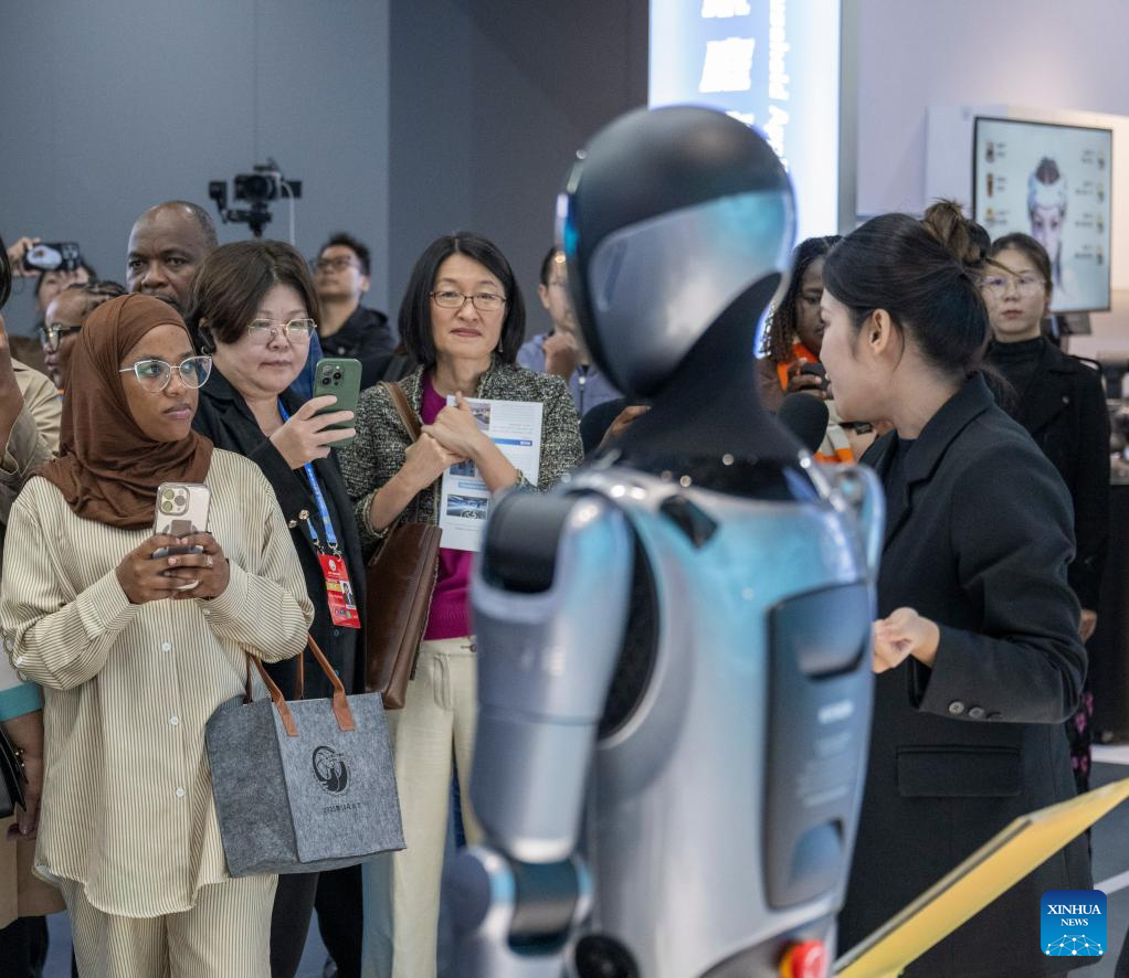 BEIJING, 14 octubre, 2025 (Xinhua) -- Representantes, quienes se encuentran en Beijing para la Conferencia de Líderes Mundiales sobre la Mujer, aprenden sobre un robot humanoide en el Mundo de los Robots de Beijing, en Beijing, capital de China, el 14 de octubre de 2025. (Xinhua/Du Zixuan)