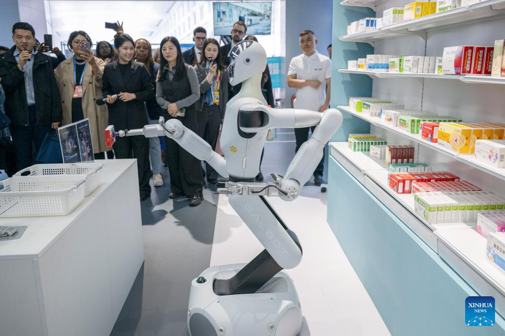 BEIJING, 14 octubre, 2025 (Xinhua) -- Representantes, quienes se encuentran en Beijing para la Conferencia de Líderes Mundiales sobre la Mujer, observan a un robot trayendo medicinas en el Mundo de los Robots de Beijing, en Beijing, capital de China, el 14 de octubre de 2025. (Xinhua/Du Zixuan)