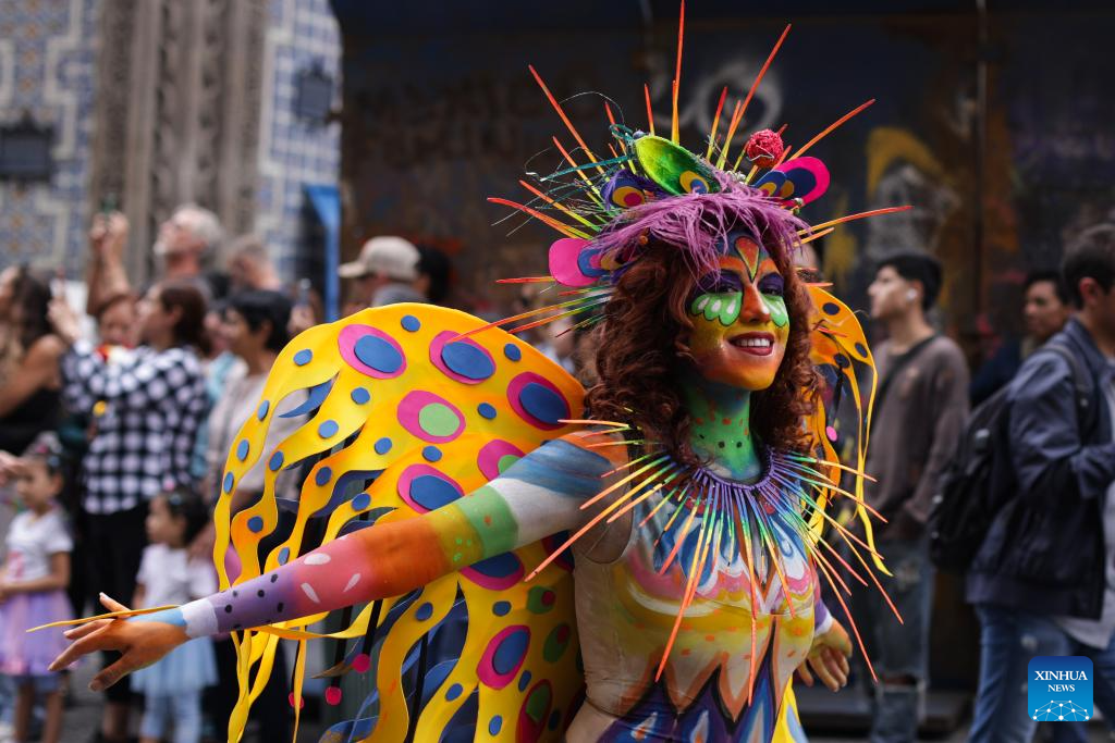 CIUDAD DE MEXICO, 18 octubre, 2025 (Xinhua) -- Una mujer disfrazada de alebrije es vista durante el 17 Desfile y Concurso de Alebrijes Monumentales del Museo de Arte Popular, en la Ciudad de México, capital de México, el 18 de octubre de 2025. (Xinhua/Francisco Cañedo)
