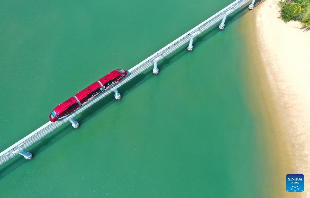 HAIKOU, 19 octubre, 2025 (Xinhua) -- Vista aérea del 19 de octubre de 2025 de un tren mini transitando en el Hainan Ocean Paradise Resort, en el distrito autónomo li de Lingshui, en la provincia de Hainan, en el sur de China. Muchos turistas optan por viajar fuera de temporada a la provincia insular china de Hainan, un popular destino turístico, debido a la bajada de precios del transporte y el alojamiento tras el feriado del Día Nacional de China. (Xinhua/Guo Cheng)