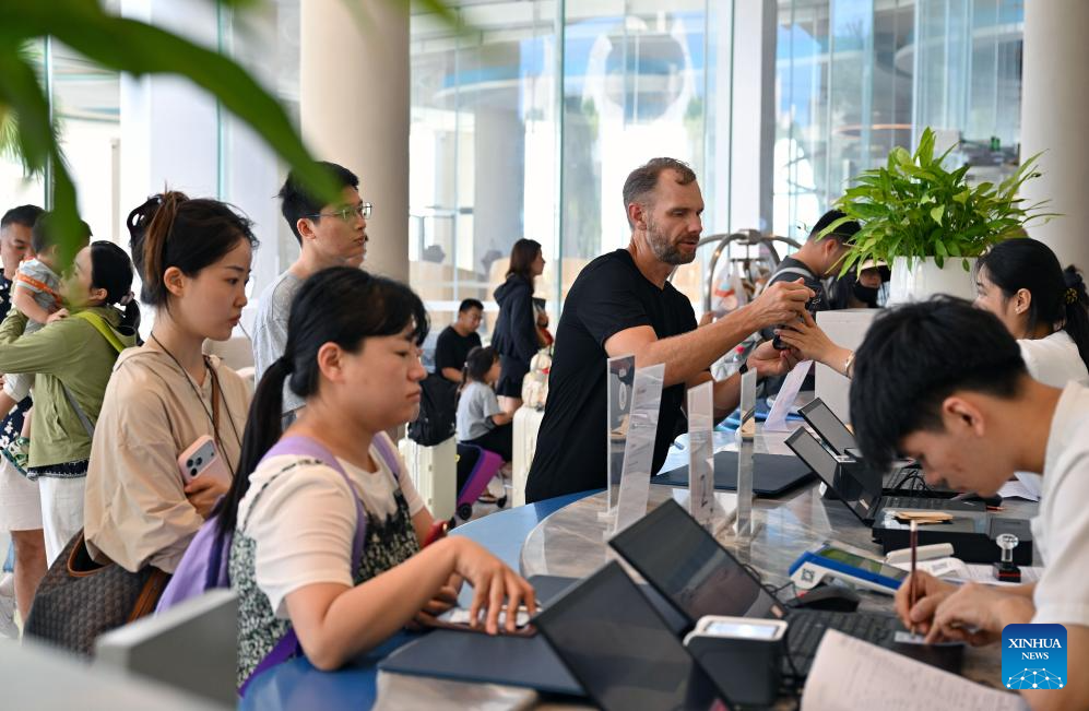 HAIKOU, 19 octubre, 2025 (Xinhua) -- Imagen del 18 de octubre de 2025 de turistas registrándose y saliendo de un hotel, en el distrito autónomo li de Lingshui, en la provincia de Hainan, en el sur de China. Muchos turistas optan por viajar fuera de temporada a la provincia insular china de Hainan, un popular destino turístico, debido a la bajada de precios del transporte y el alojamiento tras el feriado del Día Nacional de China. (Xinhua/Guo Cheng)