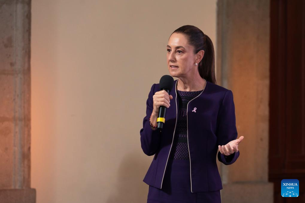 Imagen proveída por la Presidencia de México de la presidenta mexicana, Claudia Sheinbaum, hablando durante su conferencia de prensa matutina, en Palacio Nacional, en la Ciudad de México, capital de México, el 21 de octubre de 2025. Sheinbaum informó el martes que 2.382 mexicanos han sido detenidos en Estados Unidos desde el inicio del actual gobierno encabezado por su homólogo Donald Trump. (Xinhua/Presidencia de México)