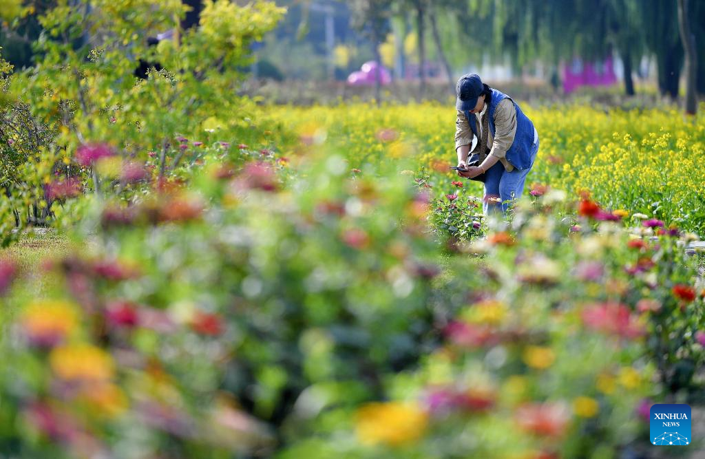 YINCHUAN, 23 octubre, 2025 (Xinhua) -- Imagen del 15 de octubre de 2025 de una ciudadana tomando fotografías de flores junto al río Diannong, en Yinchuan, en la región autónoma de la etnia hui de Ningxia, en el noroeste de China. (Xinhua/Li Jing)