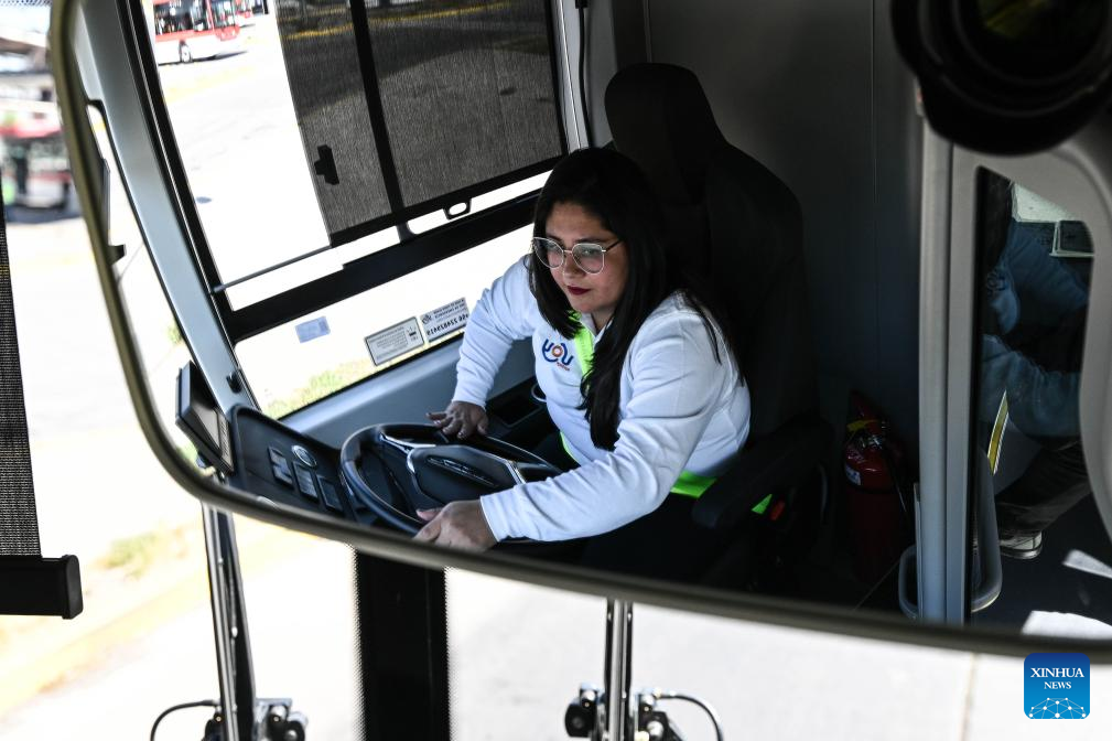 Imagen del 20 de octubre de 2025 de la conductora del transporte público, Yasna Parra, conduciendo un autobús eléctrico chino, en el electroterminal El Conquistador, en la comuna de Maipú, en Santiago, capital de Chile. La electromovilidad en el transporte público chileno es una de las postales del país sudamericano en el mundo y lo ha logrado gracias al trabajo hecho entre los sectores públicos y privados, quienes han utilizado la tecnología china para desarrollarla, un ejemplo de colaboración en el Asia-Pacífico para avanzar en el cuidado de las personas y el medio ambiente. (Xinhua/Jorge Villegas)