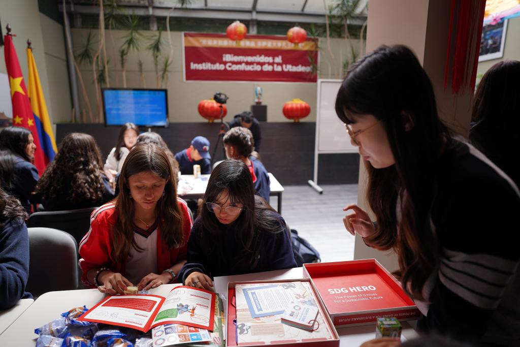 Imagen del 30 de octubre de 2025 de jóvenes participando en una actividad interactiva durante un foro en el marco del Día Mundial de las Ciudades, en la Universidad Jorge Tadeo Lozano, en Bogotá, capital de Colombia. Analistas y expertos en urbanización se dieron cita en la Universidad Jorge Tadeo Lozano de Bogotá en el marco del Día Mundial de las Ciudades, ocasión que sirvió para que especialistas chinos y colombianos intercambiaran opiniones sobre el urbanismo. (Xinhua/Andrés Moreno)