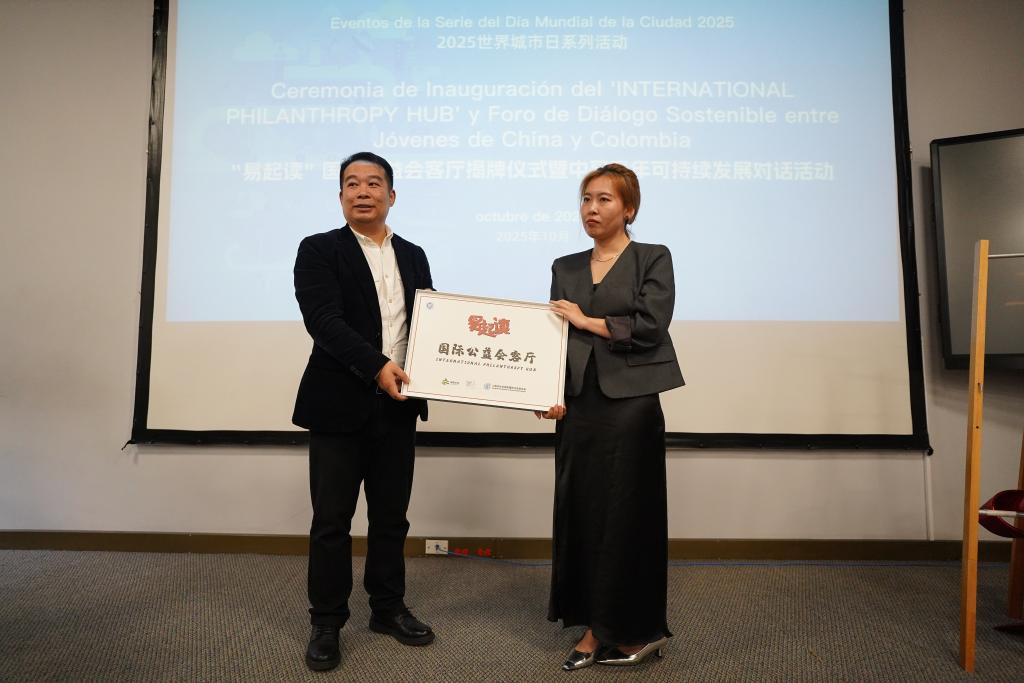 Imagen del 30 de octubre de 2025 del director del Centro de Innovación y Desarrollo Social Songding de Shanghai, Guo Yangang (i), y la directora del Instituto Confucio de la Universidad Jorge Tadeo Lozano, Fang Han (d), sosteniendo una placa conmemorativa durante un foro en el marco del Día Mundial de las Ciudades, en la Universidad Jorge Tadeo Lozano, en Bogotá, capital de Colombia. Analistas y expertos en urbanización se dieron cita en la Universidad Jorge Tadeo Lozano de Bogotá en el marco del Día Mundial de las Ciudades, ocasión que sirvió para que especialistas chinos y colombianos intercambiaran opiniones sobre el urbanismo. (Xinhua/Andrés Moreno)