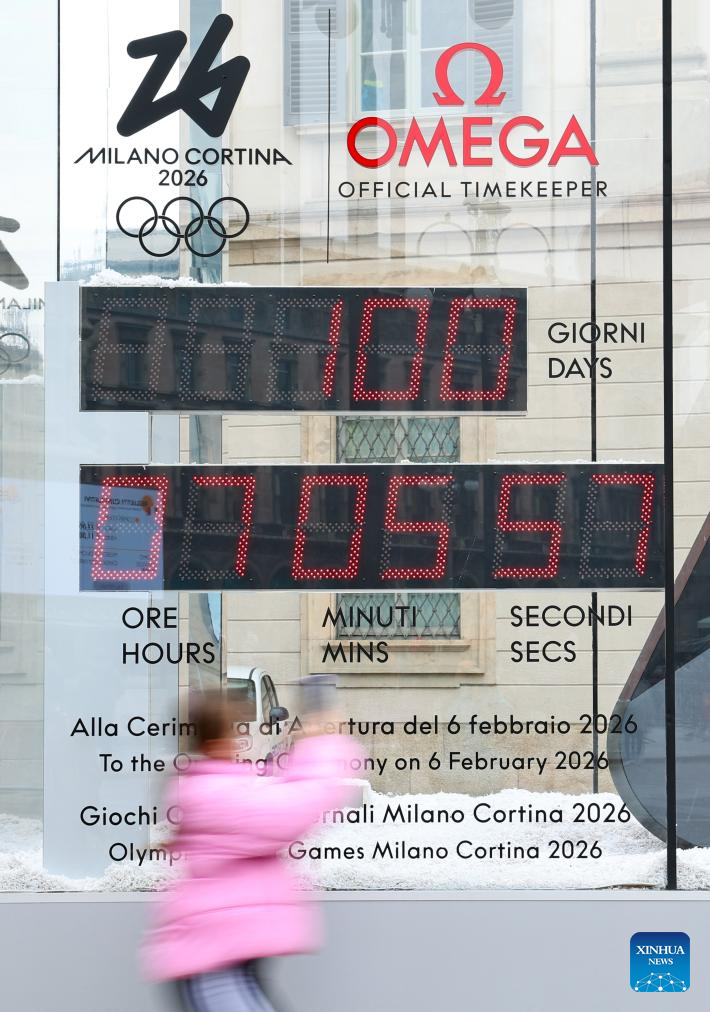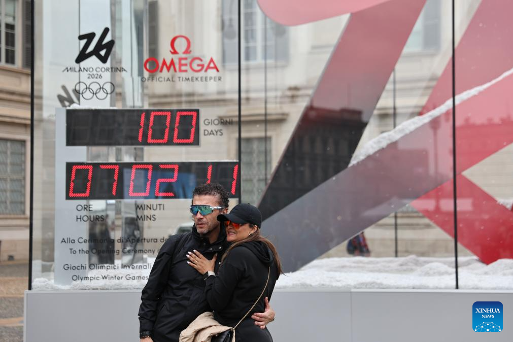 MILAN, 30 octubre, 2025 (Xinhua) -- Imagen del 29 de octubre de 2025 de personas posando para fotografías junto al contador de la cuenta regresiva digital de los Juegos Olímpicos de Milán Cortina 2026, en Milán, Italia. Una ceremonia para marcar los 100 días para la inauguración de los Juegos Olímpicos de Invierno de Milán Cortina 2026 se llevó a cabo en el Palazzo Lombardia en Milán, en donde los organizadores develaron los podios oficiales de los Juegos Olímpicos y Paralímpicos y presentaron a 12 "portadores de la antorcha digital", que simboliza el inicio de la etapa final de los preparativos para el evento. (Xinhua/Li Jing)