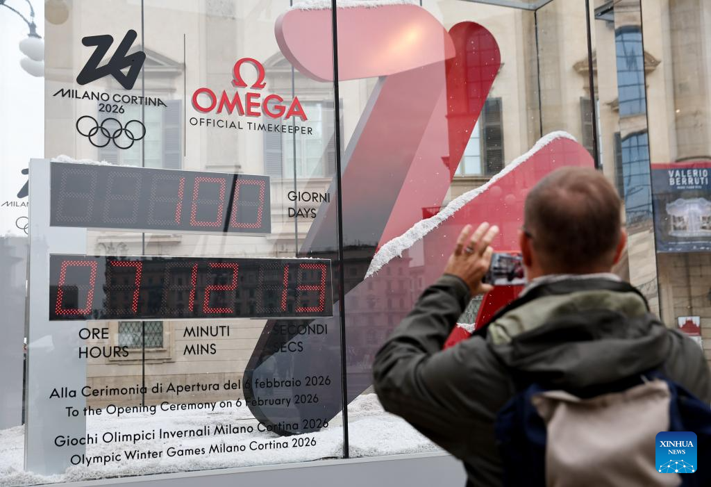 MILAN, 30 octubre, 2025 (Xinhua) -- Imagen del 29 de octubre de 2025 de un hombre tomando una fotografía del contador de la cuenta regresiva digital de los Juegos Olímpicos de Milán Cortina 2026, en Milán, Italia. Una ceremonia para marcar los 100 días para la inauguración de los Juegos Olímpicos de Invierno de Milán Cortina 2026 se llevó a cabo en el Palazzo Lombardia en Milán, en donde los organizadores develaron los podios oficiales de los Juegos Olímpicos y Paralímpicos y presentaron a 12 "portadores de la antorcha digital", que simboliza el inicio de la etapa final de los preparativos para el evento. (Xinhua/Li Jing)