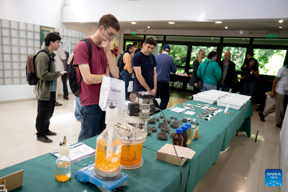 CASTELAR, 31 octubre, 2025 (Xinhua) -- Personas observan los elementos exhibidos en una exposición de bioinsumos en el marco del seminario "De Residuos a Recursos: Innovaciones Internacionales en Agricultura Sostenible", llevado a cabo en la sede del Instituto Nacional de Tecnología Agropecuaria, en la ciudad de Castelar, Argentina, el 31 de octubre de 2025. La cooperación científica entre Argentina y China permite hacer frente a los distintos desafíos que generan los residuos orgánicos animales, a la vez que propicia una mejora en la vida de comunidades agrícolas. (Xinhua/Martín Zabala)