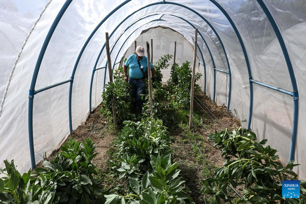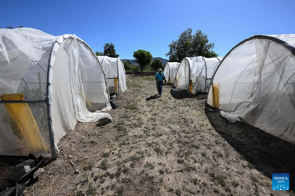 COQUIMBO, 6 noviembre, 2025 (Xinhua) -- Imagen del 29 de octubre 2025 del agricultor Rolando Rojas caminando frente a invernaderos de plantación de habas en la Parcela de Multiplicación de Semillas del Instituto de Investigaciones Agropecuarias de Chile, en la comuna de Vicuña, en la región de Coquimbo, Chile. La sequía estructural que azota en el norte chileno ha cambiado la forma de hacer agricultura, sin embargo, un grupo de resilientes agricultores se han transformado en los "guardianes de las semillas", al cuidar los granos para proteger el ecosistema y los sabores atávicos de los eclécticos valles del país sudamericano. (Xinhua/Jorge Villegas)