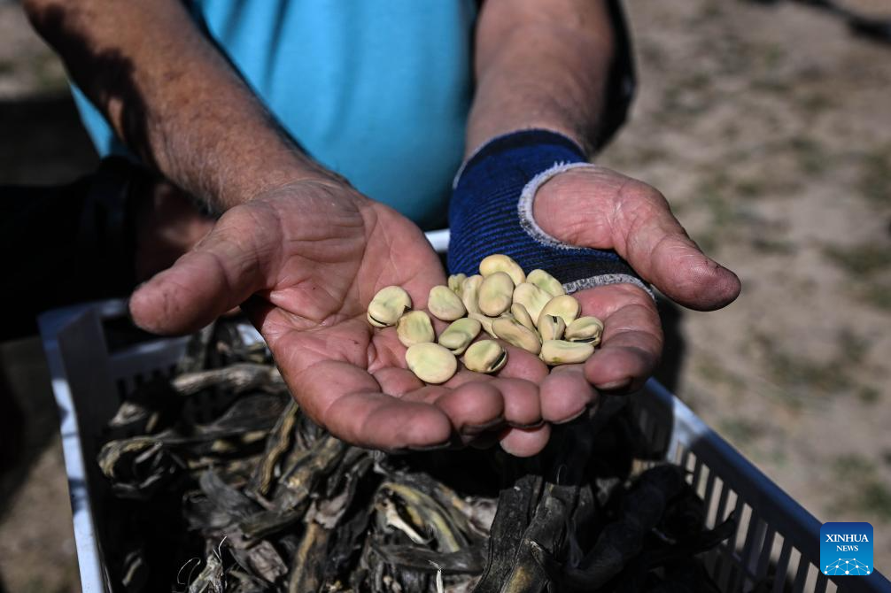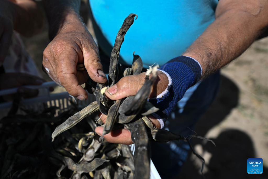COQUIMBO, 6 noviembre, 2025 (Xinhua) -- Imagen del 29 de octubre 2025 del agricultor Rolando Rojas recolectando semillas de las vainas de habas en la Parcela de Multiplicación de Semillas del Instituto de Investigaciones Agropecuarias de Chile, en la comuna de Vicuña, en la región de Coquimbo, Chile. La sequía estructural que azota en el norte chileno ha cambiado la forma de hacer agricultura. Sin embargo, un grupo de resilientes agricultores se han transformado en los "guardianes de las semillas", al cuidar los granos para proteger el ecosistema y los sabores atávicos de los eclécticos valles del país sudamericano. (Xinhua/Jorge Villegas)