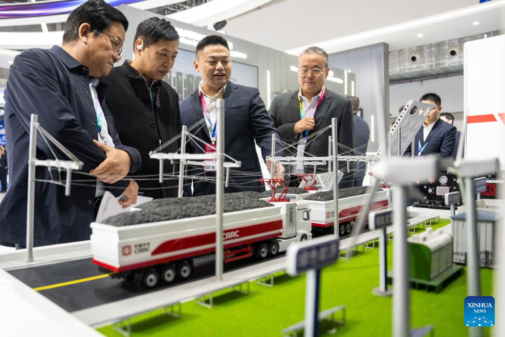 ZHUZHOU, 7 noviembre, 2025 (Xinhua) -- Un expositor (3-i) presenta un sistema para el transporte terrestre electrificado a los visitantes durante la Exposición Internacional de la Industria del Transporte Ferroviario y Fabricación de Equipos de China 2025, en Zhuzhou, en la provincia de Hunan, en el centro de China, el 7 de noviembre de 2025. Con una superficie de exhibición de unos 40.000 metros cuadrados, la exposición comenzó aquí el viernes, abarcando una amplia gama de sectores, como el transporte ferroviario y la fabricación de equipos, piezas clave y materias primas, demostración de alta tecnología, sistemas inteligentes, operación y mantenimiento, y diseño y consultoría de infraestructura. La levitación magnética y otras tecnologías de vanguardia se destacan en este evento. (Xinhua/Chen Sihan)