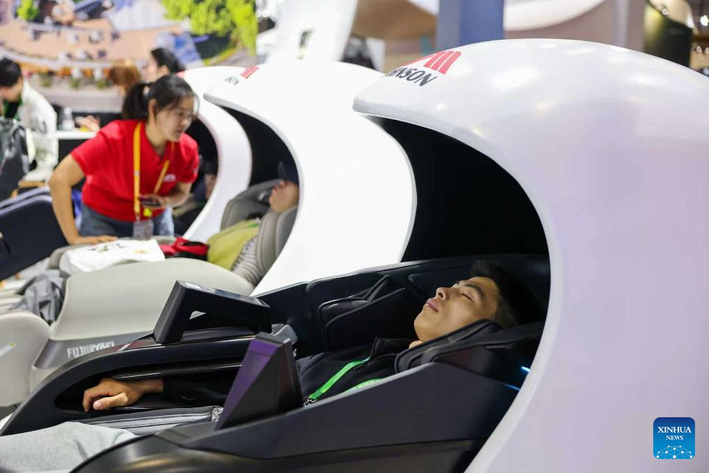 SHANGHAI, 8 noviembre, 2025 (Xinhua) -- Visitantes prueban los sillones de masaje de Johnson Health Tech en el área de exposición de Bienes de Consumo durante la VIII Exposición Internacional de Importaciones de China (CIIE, por sus siglas en inglés), en Shanghai, en el este de China, el 8 de noviembre de 2025. En el área de exposición de Bienes de Consumo de la VIII CIIE se exhibieron de forma destacada prendas de vestir, productos químicos de uso diario, muebles para el hogar y productos culturales y deportivos, lo que refleja las tendencias de consumo mundiales y las mejoras en la calidad de vida. (Xinhua/Wang Zecong)