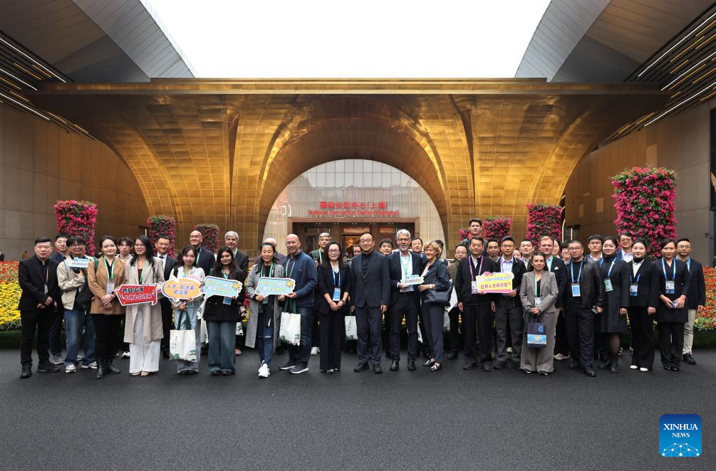 SHANGHAI, 8 noviembre, 2025 (Xinhua) -- Invitados posan para una fotografía grupal frente a la puerta del Centro Nacional de Convenciones y Exposiciones (Shanghai) durante la VIII Exposición Internacional de Importaciones de China (CIIE, por sus siglas en inglés), en Shanghai, en el este de China, el 8 de noviembre de 2025. Más de 30 talentos extranjeros y sus familias fueron invitados a visitar la VIII CIIE en el Centro Nacional de Convenciones y Exposiciones (Shanghai) durante un evento temático el sábado. (Xinhua/Fang Zhe)
