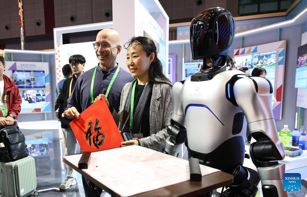 SHANGHAI, 8 noviembre, 2025 (Xinhua) -- Invitados sostienen una caligrafía escrita por un robot humanoide en el Pabellón de China durante la VIII Exposición Internacional de Importaciones de China (CIIE, por sus siglas en inglés), en Shanghai, en el este de China, el 8 de noviembre de 2025. Más de 30 talentos extranjeros y sus familias fueron invitados a visitar la VIII CIIE en el Centro Nacional de Convenciones y Exposiciones (Shanghai) durante un evento temático el sábado. (Xinhua/Fang Zhe)