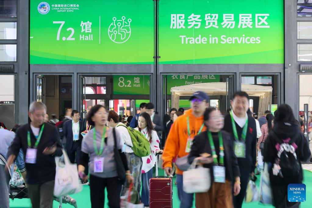 SHANGHAI, 9 noviembre, 2025 (Xinhua) -- Vista del área de Exposición de Comercio de Servicios durante la VIII Exposición Internacional de Importaciones de China (CIIE, por sus siglas en inglés), en Shanghai, en el este de China, el 9 de noviembre de 2025. El Area de Exposición Comercial de Servicios de la CIIE de este año se centra en la integración de recursos, atrayendo a los principales proveedores de servicios mundiales y clústeres industriales, al tiempo que impulsa el desarrollo coordinado y abierto de los sectores de servicios y manufactura. Esto genera servicios de apoyo más especializados que ofrecen a las empresas nuevas oportunidades de crecimiento compartido. (Xinhua/Wang Xiang)