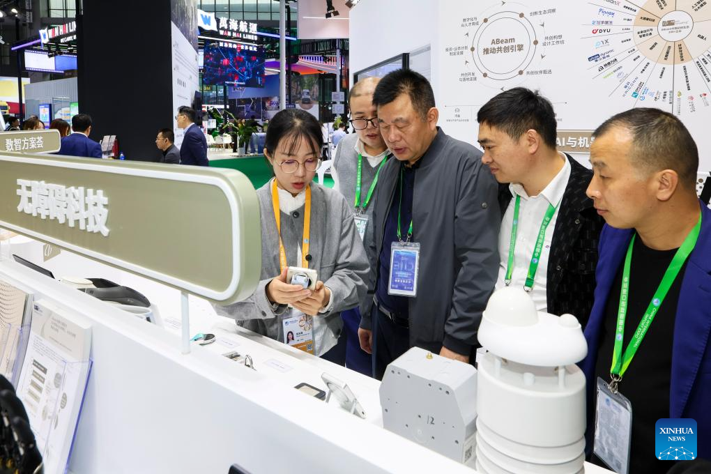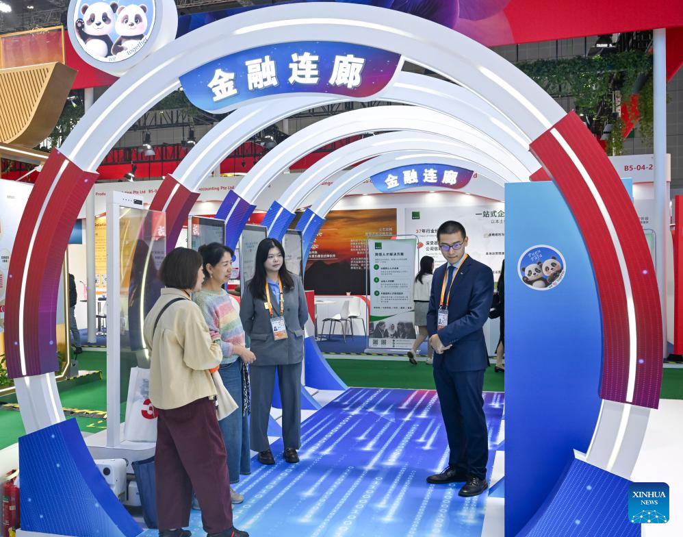 SHANGHAI, 9 noviembre, 2025 (Xinhua) -- Visitantes experimentan instalaciones interactivas en el estand del Banco de Desarrollo Pudong de Shanghai en el área de Exposición de Comercio de Servicios, durante la VIII Exposición Internacional de Importaciones de China (CIIE, por sus siglas en inglés), en Shanghai, en el este de China, el 9 de noviembre de 2025. El Area de Exposición Comercial de Servicios de la CIIE de este año se centra en la integración de recursos, atrayendo a los principales proveedores de servicios mundiales y clústeres industriales, al tiempo que impulsa el desarrollo coordinado y abierto de los sectores de servicios y manufactura. Esto genera servicios de apoyo más especializados que ofrecen a las empresas nuevas oportunidades de crecimiento compartido. (Xinhua/Chen Haoming)