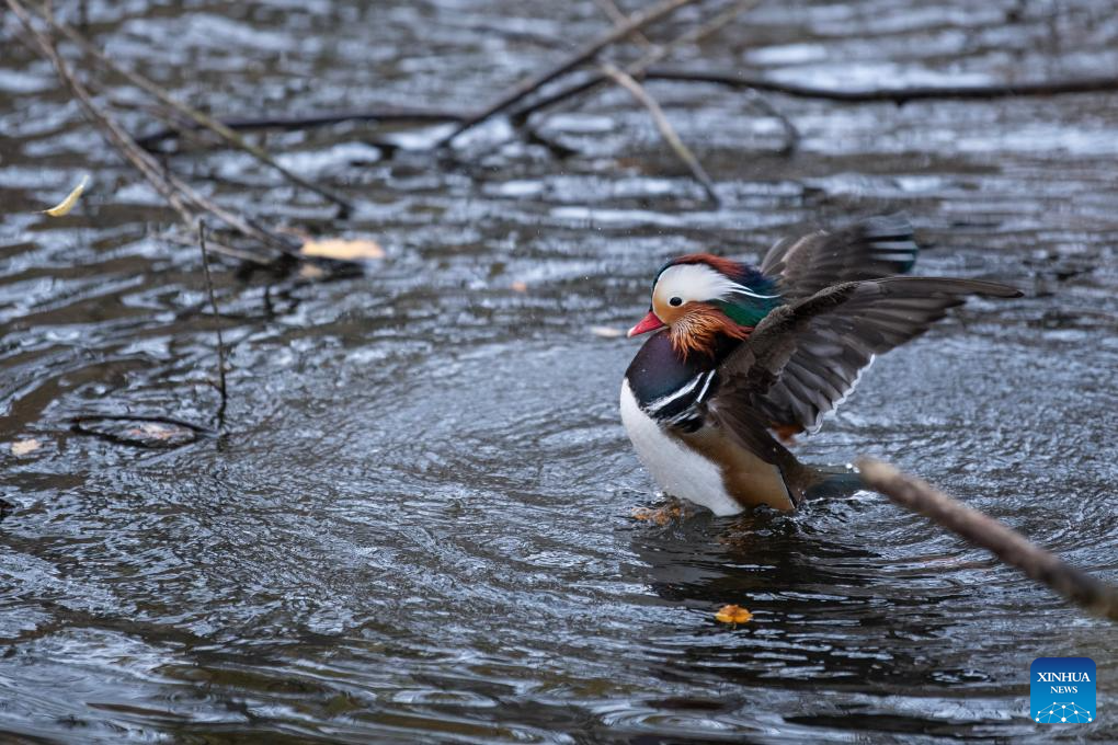 BERLIN, 9 noviembre, 2025 (Xinhua) -- Imagen del 8 de noviembre de 2025 de un pato mandarín visto en el jardín del Palacio de Charlottenburg, en Berlín, Alemania. (Xinhua/Zhang Haofu)