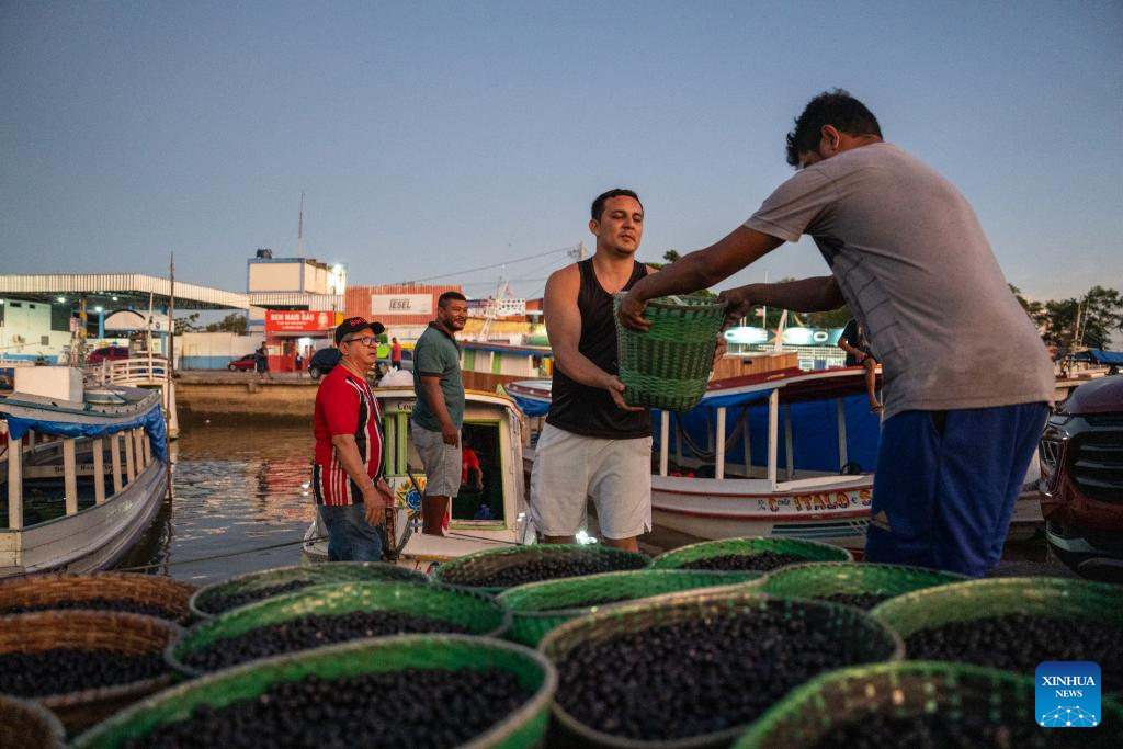 AMAPA, 10 noviembre, 2025 (Xinhua) -- Imagen del 9 de noviembre de 2025 de empleados descargando frutas frescas transportadas en un bote, en Macapá, capital del estado de Amapá, Brasil. Hoy, mientras la atención mundial se centra en la conservación del Amazonas, Macapá se erige como un claro ejemplo de armonía entre la vida humana y la naturaleza. (Xinhua/Wang Tiancong)