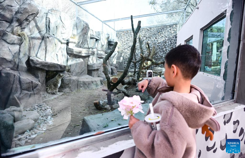 XINING, 15 noviembre, 2025 (Xinhua) -- Visitantes observan un leopardo de las nieves en el Parque de Vida Silvestre de Xining, en la provincia de Qinghai, en el noroeste de China, el 15 de noviembre de 2025. La casa del leopardo del Parque de Vida Silvestre de Xining reabrió al público tras un mes de renovación. (Xinhua/Qi Zhiyue)