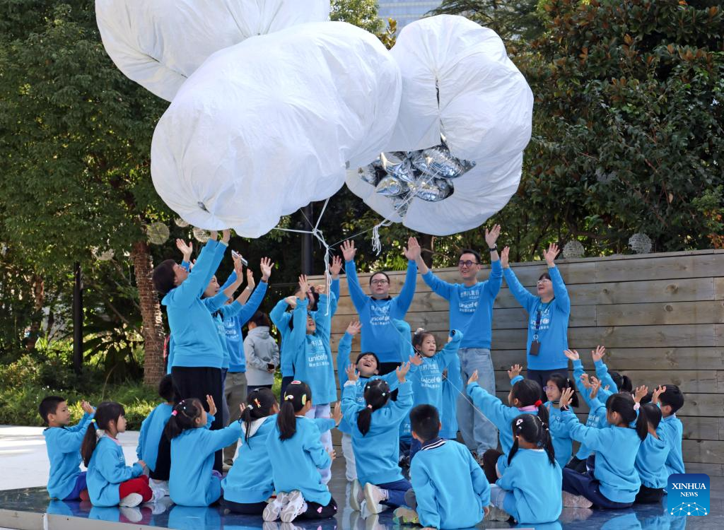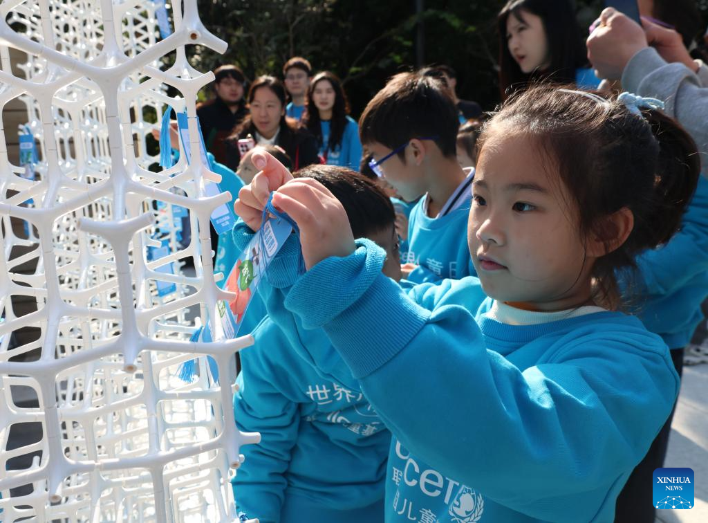 BEIJING, 15 noviembre, 2025 (Xinhua) -- Niños elaboran una instalación artística junto con el equipo de diseño durante un evento del Día Mundial de la Infancia, en Shanghai, en el este de China, el 15 de noviembre de 2025. El Día Mundial de la Infancia se celebrará el 20 de noviembre de este año. Se llevaron a cabo diversas actividades en todo el país para conmemorar la llegada de la fecha. (Xinhua/Pan Zongyuan)