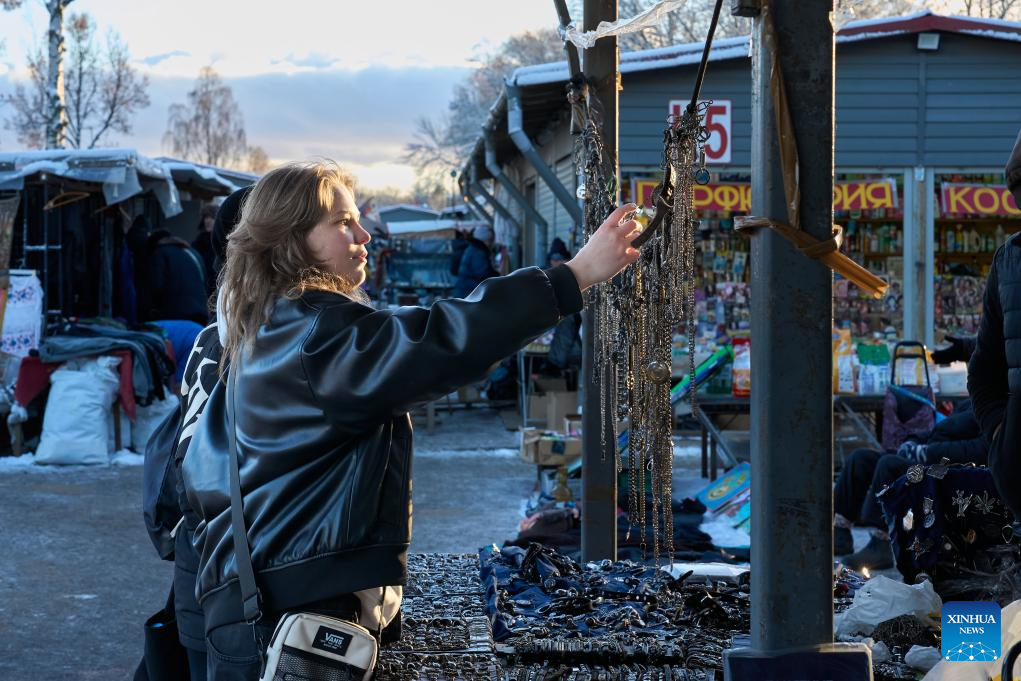 SAN PETERSBURGO, 16 noviembre, 2025 (Xinhua) -- Imagen del 15 de noviembre de 2025 de una mujer comprando accesorios en el Mercado de Pulgas de Udelka, uno de los mercados de pulgas más grandes de Rusia, en San Petersburgo, Rusia. (Xinhua/Guo Feizhou)