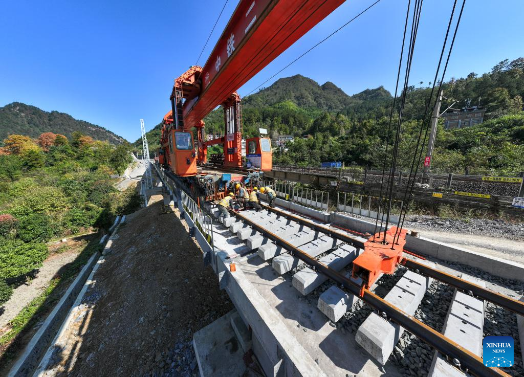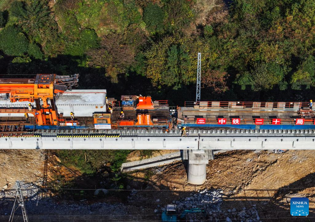 DUYUN, 16 noviembre, 2025 (Xinhua) -- Trabajadores son vistos en el sitio de construcción de un puente a lo largo del proyecto de extensión del sur de la vía de ferrocarril Weng'an-Machangping, en la provincia de Guizhou, en el suroeste de China, el 16 de noviembre de 2025. Los trabajos de montaje de vigas y tendido de vías del tramo sur de la extensión sur-norte del ferrocarril Weng'an-Machangping se completaron con éxito el domingo. Este proyecto de extensión sur-norte de 148 kilómetros de la vía de ferrocarril Weng'an-Machangping es un proyecto clave para los ferrocarriles orientados a los recursos en la provincia de Guizhou. (Xinhua/Yang Wenbin)